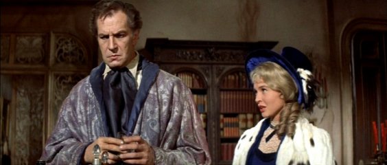 I prefer for the moment to omit comment on The Oblong Box and The Haunted Palace, works which have a few things to recommend them but on the whole seem misconceived. The two tales that complement “Morella” in Tales of Terror, “The Black Cat” and “The Fact in the Case of M. Valdemar” likewise have some compelling moments (the comic turns by Price and Peter Lorre in “The Black Cat,” which is also centered on marriage, and the malevolent Carmichael (the always dazzling Basil Rathbone) in “Valdemar,” whose sainted, decaying patriarch is kept alive, even in death, only to dissolve into a blob of “putrescence”).